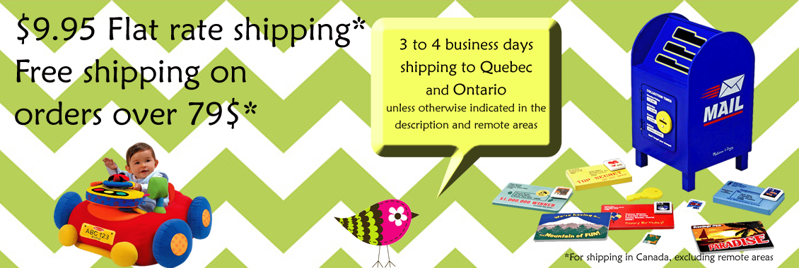 $9.95 Flat Rate Shipping • Free Shipping on Orders over $79 before taxes • Free Shipping when you choose a Pickup Point. Unless a delay is mentionned in the product information, shipping delay is 4-5 business days (Quebec, Ontario) and up to 7 business days everywhere else in Canada and remote areas (Quebec and Ontario). If you stay in a remote area, Julie Jouets will send you an email if there is additional fees applicable. Do not worry, if you don't want to pay for these fees, we can cancel your order without any fee.