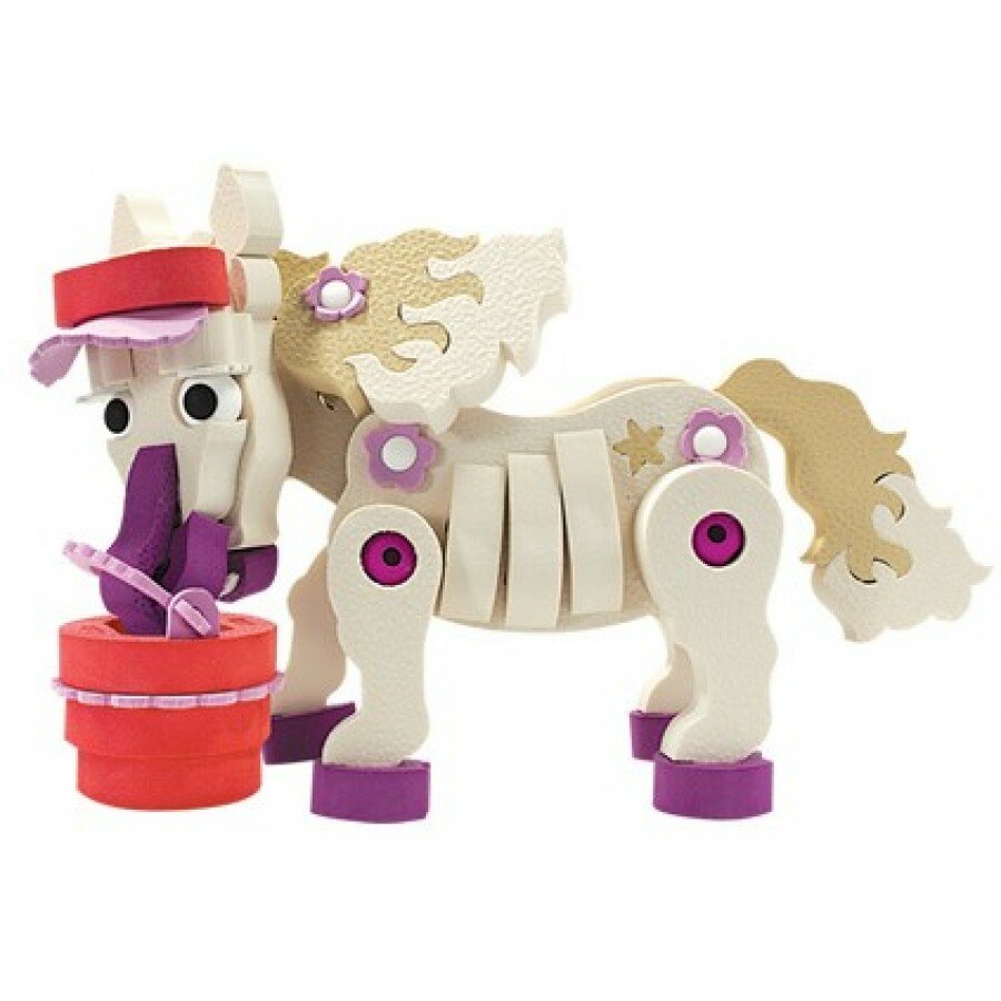 Galopant dans les prés au gré du vent, ces deux poneys occuperont vos enfants sans aucun doute.Ceux-ci pourront faire preuve d'imagination tout en s'amusant avec les accessoires dont le ballon, la brosse, le seau, la cape, la casquette et les fleurs décoratives! Insère les connecteurs de plastiques dans les pièces de mousse... et le tour est joué! Les pièces Bloco sont modulaires et permettent de construire et d'articuler une multitude de modèles. Fabriqué au Québec.