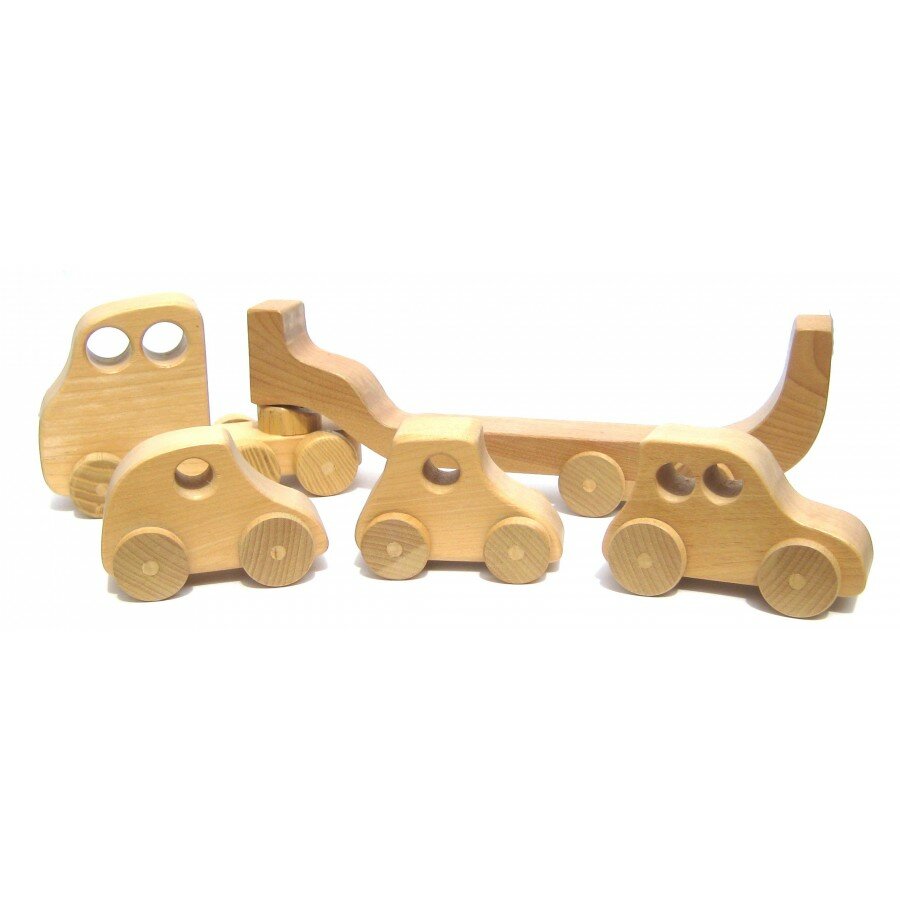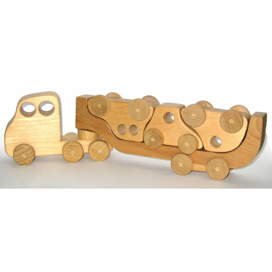 Ce camion contient une remorque transportant 3 voitures qui s'emboîtent l'une dans l'autre. Naturel et écologique, ce camion à remorque en bois fera le bonheur des amateurs de véhicules, tout en développant l'esprit logique et la mémoire pour replacer les véhicules dans le bon ordre. Les trous perçés dans chaque véhicule facilite la prise pour les petites mains. Fabriqué à partir de différentes essences de bois franc (érable, merisier, chêne, frêne) et d'une finition acrylique à base d'eau, ce tracteur a été fabriqué à la main par un artisan québécois. C'est un jouet naturel, idéal pour stimuler l'imagination des enfants. Fait à la main, de façon artisanale, au Québec. Fait à partir de matériaux recyclés.