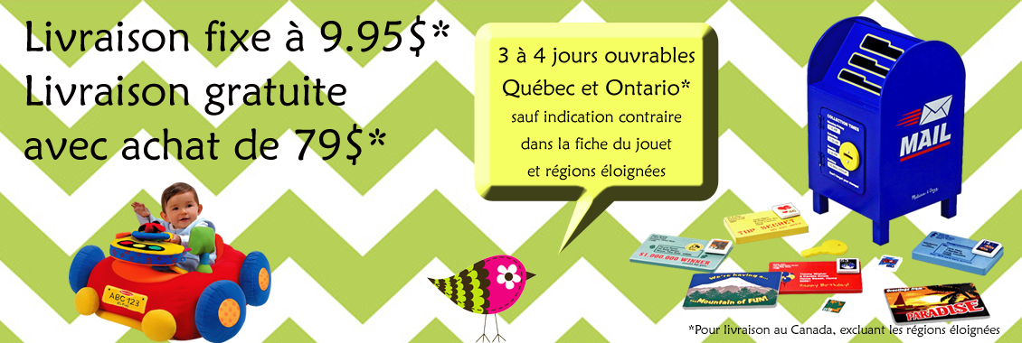 Frais fixe de 9.95 $ • Gratuit avec achat de 79 $ avant taxes • Gratuit pour un ramassage à un point de cueillette. Sauf indication contraire dans la fiche du produit, les commandes sont livrées en 3 à 4 jours ouvrables (Québec, Ontario) et jusqu'à 7 jours ouvrables partout au Canada et dans les régions éloignées du Québec et Ontario. Si vous demeurez dans une région éloignée qui nécessite des frais de livraison supplémentaires, Julie Jouets vous avisera par courriel.
