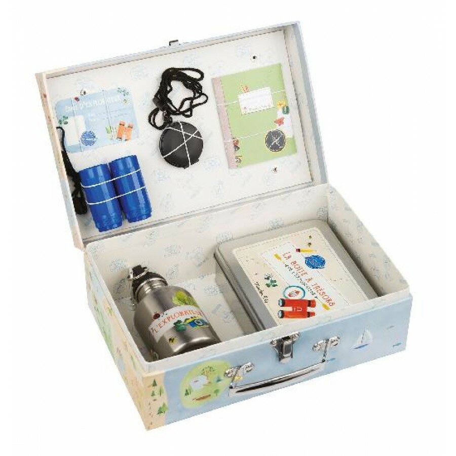 Pour jouer les explorateurs et découvrir le monde, voici une belle valise illustrée style chasse au trésor contenant : une boussole de poche, une gourde, une paire de jumelles, un carnet de voyage, une boîte à trésors.